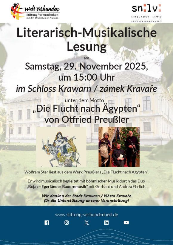 Die Landesversammliung der deutschen Vereine in der Tschechischen Republik und die Stiftung Verbundenheut mit den Deutschen im Ausland laden zu ihrer alljährlichen Weihnachtslesung. Wolfgang Ster liest aus Otfried Preußlers Werk „Die Flucht nach Ägypten“. Musikalisch untermalt wird die Lesung vom Duo „Bojaz – Egerländer Bauernmusik“. mit Gerhard und Andrea Ehrlich.