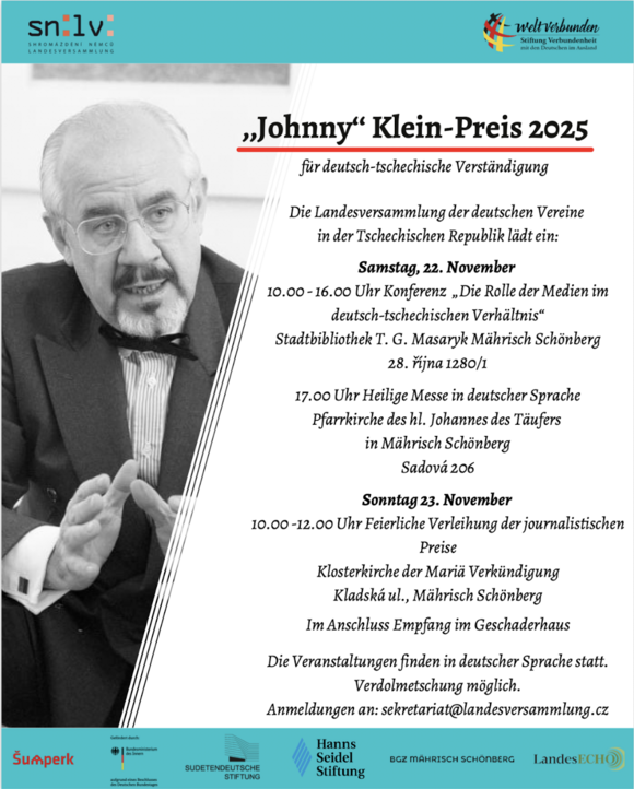 Die Landesversammlung der deutschen Vereine in der Tschechischen Republik verleiht gemeinsam mit der Stiftung Verbundenheit die diesjährigen Johnny-Klein-Preise für deutsch-tschechische Verständigung.